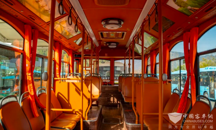走进车厢,从座椅到车顶均以橙色为主,并大面积采用软包材质。车内配备影音系统和多色氛围灯,适合各种文旅场景需求。