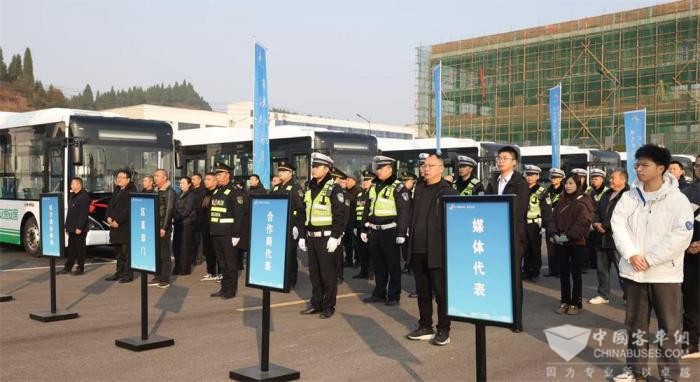 仪式现场,首批13辆崭新的新能源公交车整齐地排列着,车头系着鲜艳的红丝带,营造出浓厚的喜庆氛围。