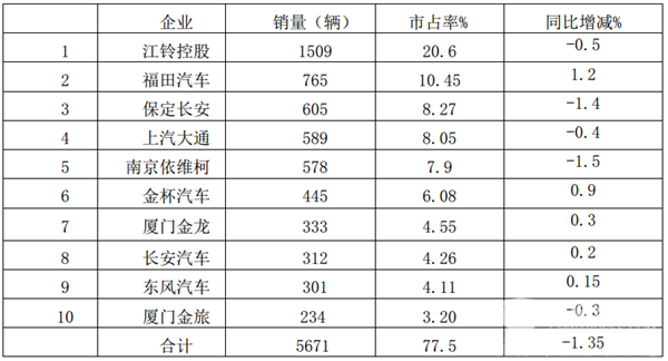 特点一、江铃独占鳌头,但同比下降;前10名主流品牌市场集中度为77.5%,同比下降1.35个百分点---前10名主流轻客企业在河南区域销量及占据份额分析