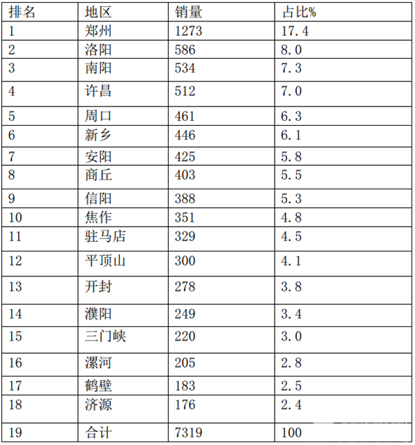 根据上牌信息,河南区域2019年1-5月18个区域销量占比统计:
