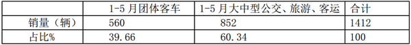 1、团客车销量为560辆,占据了天津区域1-5月大中型客车整体销量近40%的份额,而大中型公交客车、客运车型及旅游客车只有60%的权重,可见团体客车占比较大。