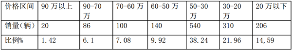 从上图表可以看出:天津区域市场在2019年1-5月销售的大中型客车中,30-50万的中档客车销量最大,比例为38.24%,其次是30-20万区间的 价格,比例为21.96%,最小的是90万以上高档客车,比例只有1.42%,这说明了天津区域大中型客车的消费水平结构,给要进入天津区域的客车厂家在产品定价和 营销策略方面提供了依据。