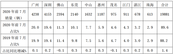上表数据表明,2020年前7月广东地区大中轻客车在各区域的分布特点: