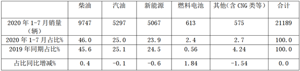 根据最新上牌信息统计,2020年1-7月广东市场按照燃料种类划分,大中轻客销量结构: