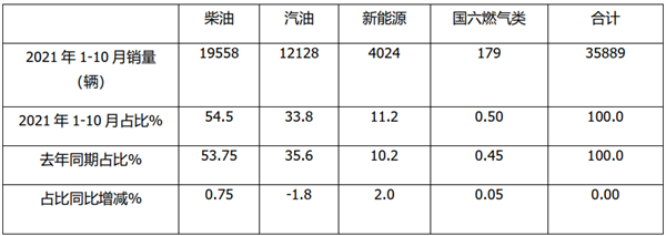 根据最新上牌信息统计,2021年1-10月江苏市场按照燃料种类划分,大中轻客销量结构: