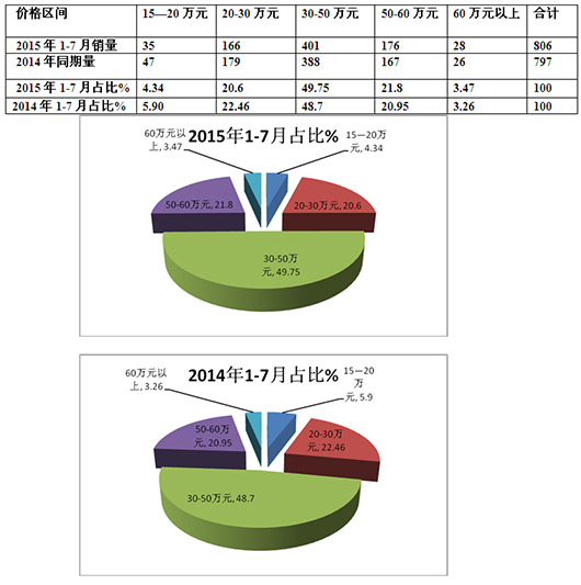 2015年1-7月按价格细分上海区域团体客车销量结构表: