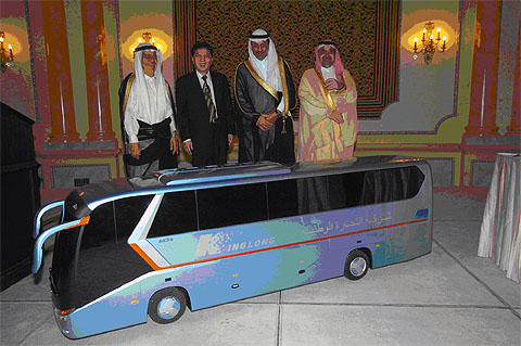 金龙客车在沙特市场保有量超1000辆,大金龙总经理江世煌向沙特客户赠送车模庆贺