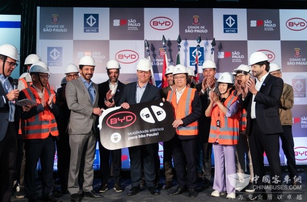 当地时间2025年10月8日,比亚迪董事长兼总裁王传福在巴西圣保罗现场考察了正在进行测试的地铁17号黄金线比亚迪云轨项目,并在同日向圣保罗市市长Ricardo Nunes正式交付首台22米长、搭载比亚迪刀片电池的纯电动铰接式大巴。圣保罗州州长Tarcísio de Freitas、比亚迪执行副总裁李柯、比亚迪集团多位高管与圣保罗地铁公司团队代表共同出席了这次活动。