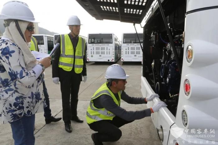 而满足上述标书中规定的严苛技术要求只是第一步,在样车出来之后的验车环节,是金旅突尼斯项目遇到的又一挑战。9月,金旅客车迎来了由突尼斯国家公交公司采购经理、技术总工,以及各公交公司业务负责人组成的验车团。与常见的验车环节不同,验车团除了仔细查验车辆外观、内饰、底盘,还要求把车辆的外饰件都打开,对配件品牌、材料都进行了仔细的查验。在上述方面都符合要求之后,参与验车的各公交公司负责人又从车辆技术、运营、售后服务等不同角度,提出了各种新需求,包括侧窗的玻璃尺寸规格尽量统一;后桥检修的开口尺寸和位置要便于后期维护;雨刷电机要便于检修,等等。而这些并不是前期标书中的技术要求,而是新增项。怎么办?为了展现出最大的诚意,在成本不断增加,交付周期紧张的情况下,金旅决定对样车继续进行整改。经过一个月的努力,这批样车终于顺利通过了突尼斯客户的二次评审。