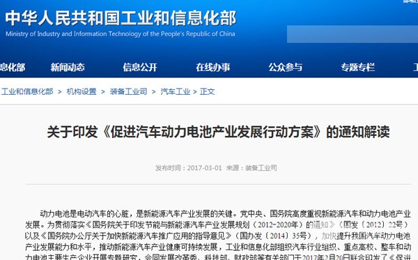 动力电池是电动汽车的心脏,是新能源汽车产业发展的关键。党中央、国务院高度重视新能源汽车和动力电池产业发展。为贯彻落实《国务院关于印发节能与新能源汽车产业发展规划(2012-2020年)的通知》(国发〔2012〕22号)以及《国务院办公厅关于加快新能源汽车推广应用的指导意见》(国办发〔2014〕35号),加快提升我国汽车动力电池产业发展能力和水平,推动新能源汽车产业健康可持续发展,工业和信息化部组织汽车行业组织、重点高校、整车和动力电池主要生产企业开展专题研究,会同发展改革委、科技部、财政部等有关部门于2017年2月20日联合印发了《促进汽车动力电池产业发展行动方案》(以下简称《行动方案》)。