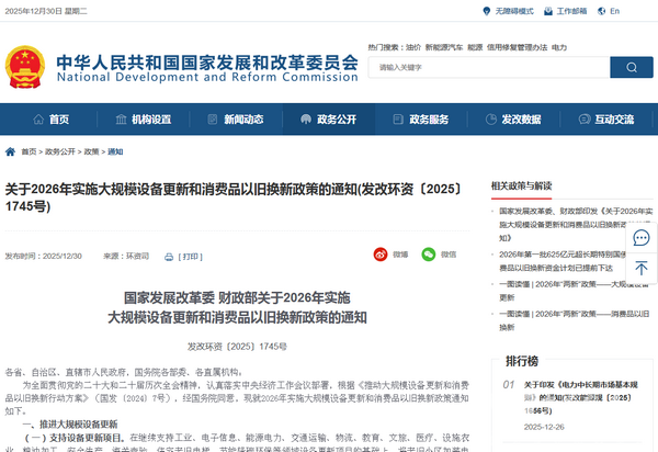 2025年12月30日,国家发展和改革委员会、财政部联合发布了《关于2026年实施大规模设备更新和消费品以旧换新政策的通知》【发改环资〔2025〕1745号】。进一步明确了2026年“两新”政策的支持范围、补贴标准和工作要求。