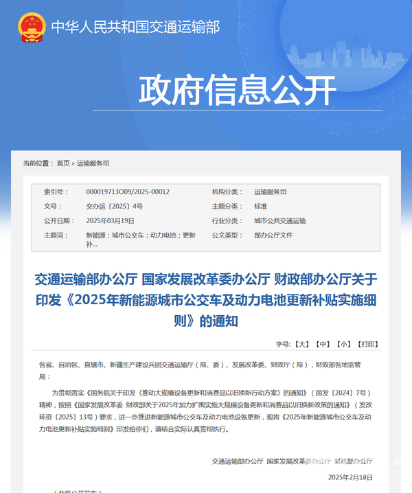 为方便业内人士查阅该《实施细则》的具体内容,现将国家交通运输部《2025年新能源城市公交车及动力电池更新补贴实施细则》(交办运〔2025〕4号)原件编发如下。