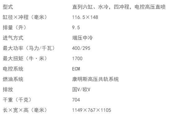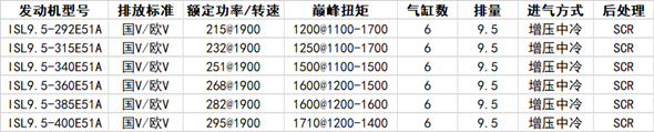 康明斯ISL系列9.5升发动机,功率范围292-400马力,采用康明斯XPI超高压燃油喷射系统,可变喷油正时,实现全转速范围内及全负荷范围内最佳燃烧状态,最大程度降低油耗。自重轻,先进的设计使发动机结构紧凑,重量比同马力其它产品轻200公斤左右,运输效率更高,广泛应用于12米豪华旅游客车等。