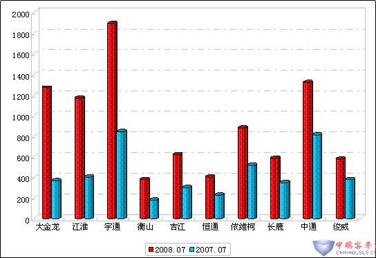 图一:2008年前7月小型客车销售增长前10名销量图