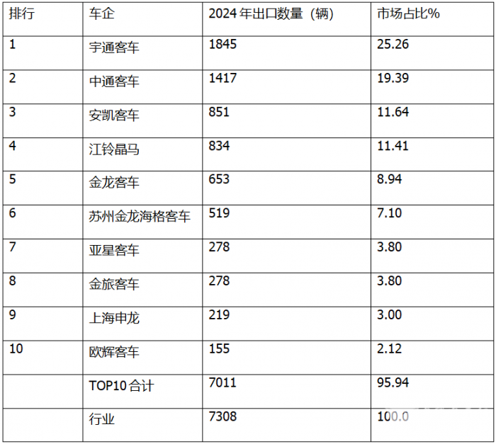 根据中国客车统计信息网统计数据,2024年我国中型座位客车累计出口7308辆,前排名前10的企业排行如下表: