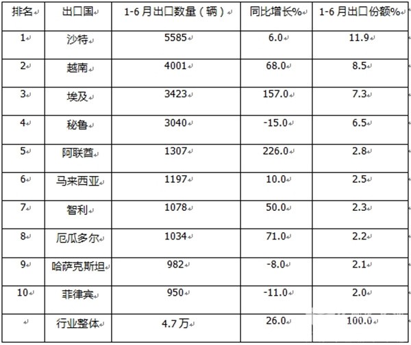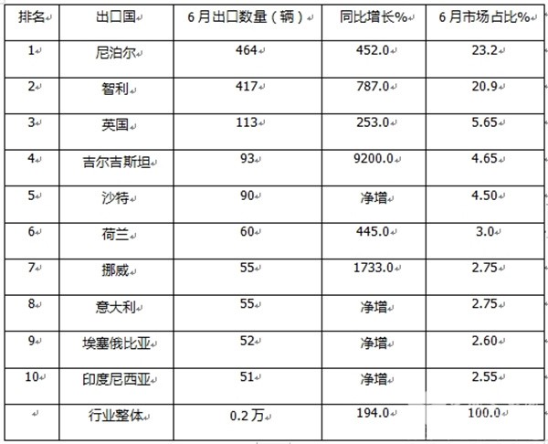 上表显示,2025年6月我国客车出口到TOP10国家中,出口数量同比及市场占比: