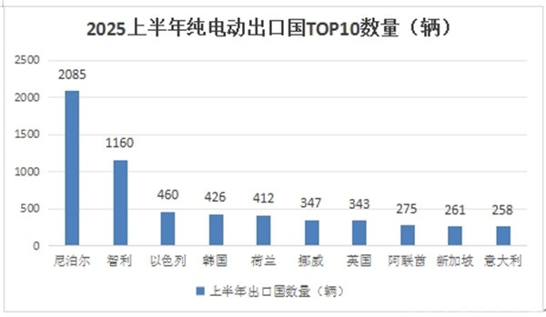 上图可见,在2025年上半年纯电动客车出口国TOP10中: