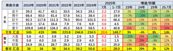 上表显示,在2025年7月国内大、中、轻客车终端销量及同比、占比中: