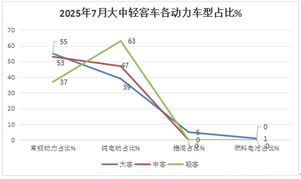 总之,“轻客电动化率达到63%,居大中轻各细分市场最高”成为2025年7月国内客车市场的一个基本特征。