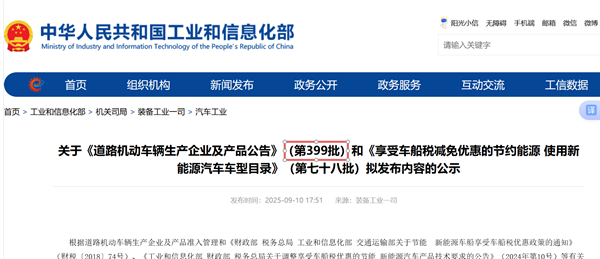 2025年9月10日,工信部发布关于《道路机动车辆生产企业及产品公告》(第399批公告,下也称”本批次公告”),这是2025年以来工信部发布的第9个批次的新车产品公告,也是2025年下半年的第3批公告。