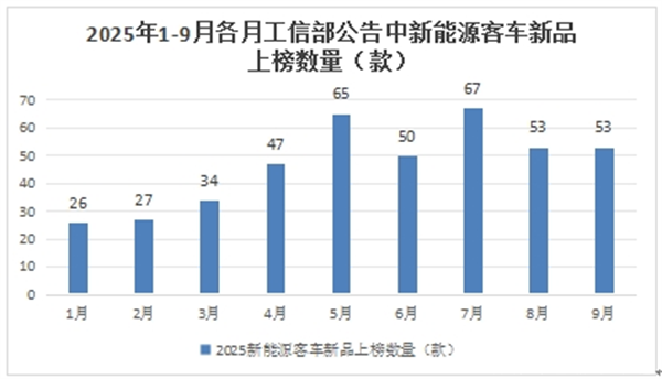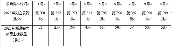 上图表显示,2025年9月工信部发布的第399批公告中,上榜新能源客车新品53款,居今年以来各月第三(与8月的第398批公告并列第三)。这或许意味着为了迎接“金九银十”客车市场旺季的到来,车企在新能源客车产品布局力度方面仍然较大。