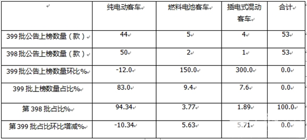 表3,根据工信部第399批公告统计数据,按技术路线划分,各车型上榜数量占比及占比环比增减: