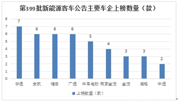 在第399批公告中有19个客车品牌企业参与了新能源客车新品申报,各个品牌上榜数量统计如下:上榜数量在2款及以上的车企品牌统计如下: