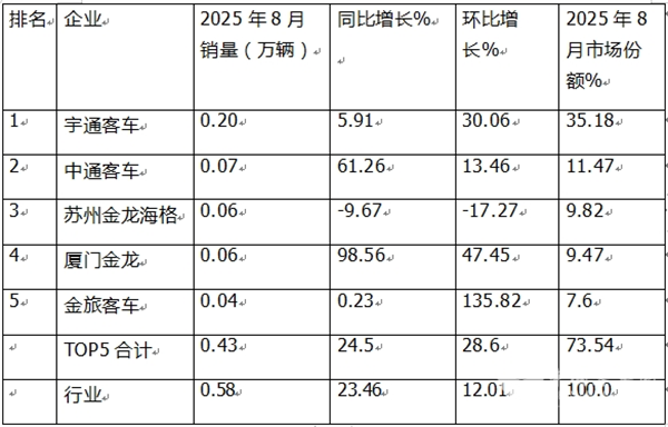 根据中汽协数据,2025年8月大型客车(含底盘)销售0.58万辆,,同比增长23.46%,环比增长12.02%;2025年8月TOP5主流企业大型客车销量、同比、环比及市场份额统计: