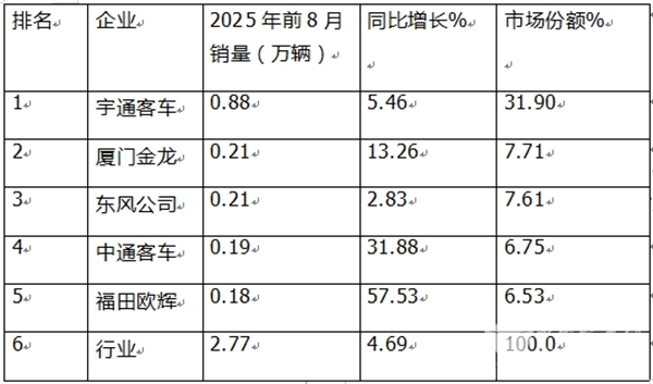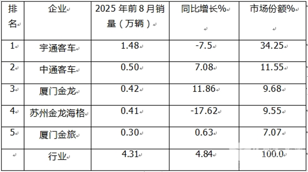 2025年8月及前8月大型、中型客车主流企业销量榜单