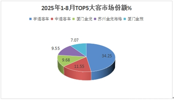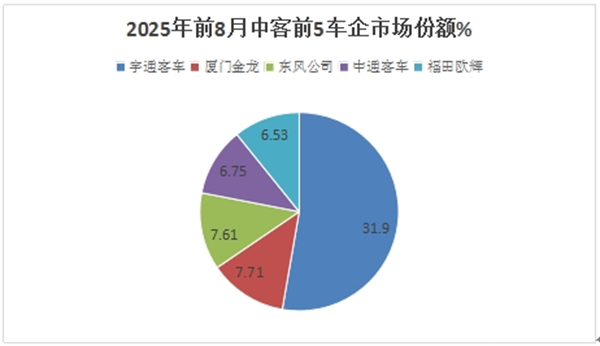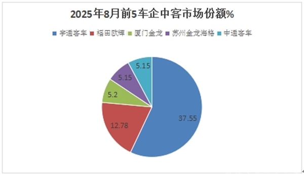 值得一提的是,2025年1-8月中型客车TOP5市场集中度为61%,也低于今年前8月大型客车市场。