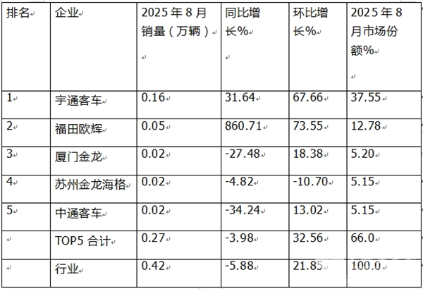 表3,TOP5主流企业2025年8月中型客车销量、同比、环比及市场份额统计: