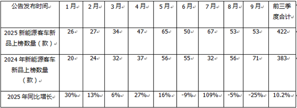 表1,根据工信部数据,2025年前三季度各月新能源客车公告上榜的新能源客车新品数量与2024年同期比较: