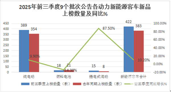 据统计,2025年前三季度工信部共计发布了9个批次(第391批—第399批)的新能源客车新品公告,累计上榜了422款新能源客车新品车型(含389款纯电动客车、18款燃料电池客车和15款插电式混动客车),比去年同期的383款增长10.2%。