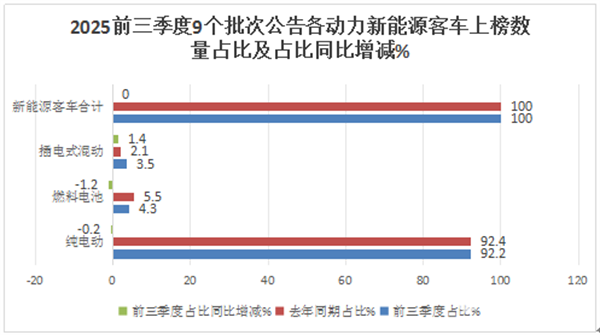 上两图显示,在2025年前三季度9个批次的公告中,各技术路线新的能源客车上榜数量及占比、占比同比增减呈现以下特征: