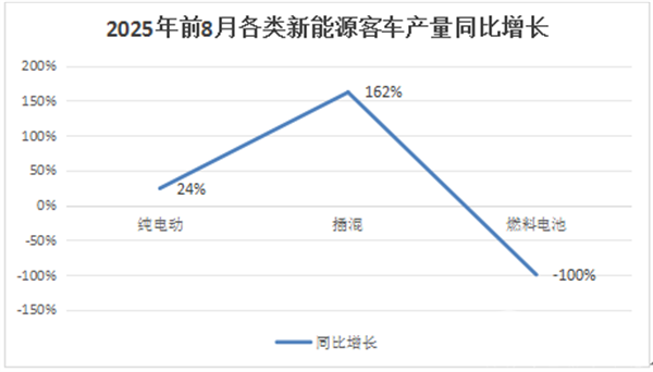 从今年前8月累计同比增速看,纯电动客车产量累计同比增长24%,插电式混动客车累计产量同比增长162%,燃料电池客车累计产量同比下降100%。