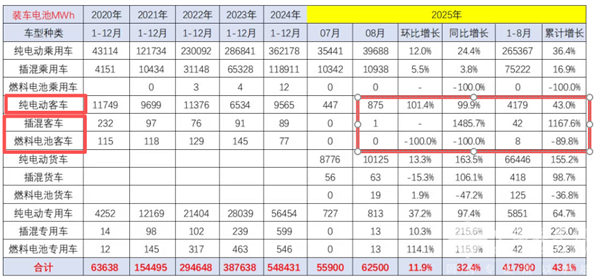 值得关注的是, 2025年8月我国新能源客车动力电池装机量为876MWh(将截图2中2025年8月份的纯电动客车装车量875MWh+2025年8月的插电式混动客车装车量1MWh+2025年8月的燃料电池客车的装车量0MWh) ,同比增长大约100%;2025年前8月新能源动力电池累计装机量大约为4229MWh(将截图2中2025年1-8月份的纯电动客车装车量4179MWh+2025年1-8月的插电式混动客车装车量42MWh+2025年1-8月的燃料电池客车的装车量8MWh),同比增长近43.4%。