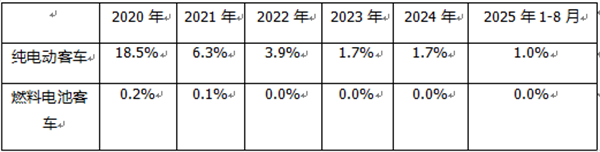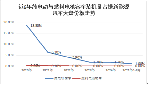 ---燃料电池客车动力电池装机量占据新能源汽车大盘的比例很少,从2020年的0.2%占比下降到2021年的0.1%占比,然后从2022年到2025年前8月占比均为零;