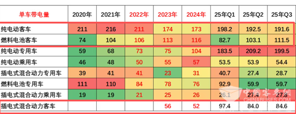 截图4,2025年前8月及近6年各类新能源客车单车平均带电量比较(数据来源:中国汽车流通协会提供)