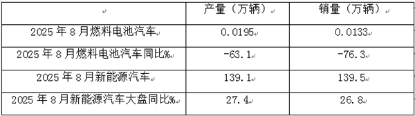 表1,根据中汽协数据,2025年8月燃料电池汽车产量同比统计: