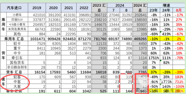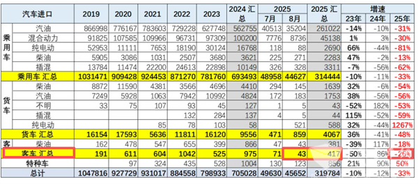 2025年1-8月我国汽车累计进口32万辆,同比下降33%,其中我国客车2025年1-8月累计进口417辆(见截图1),同比(去年同期我国客车累计进口563辆,见截图2)下降26%,跑赢今年1-8月我国整个汽车进口大盘(-33%)。