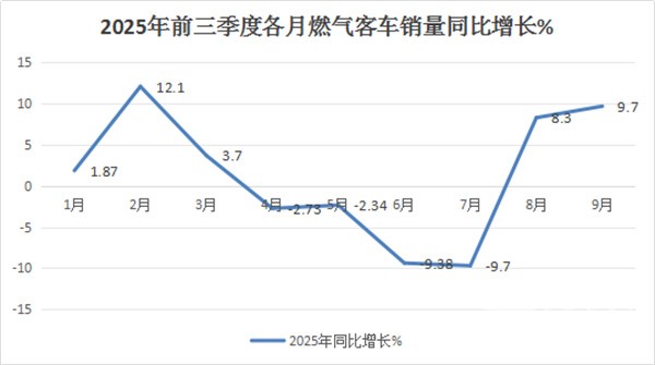 上图显示,在2025年前三季度各月燃气客车销量及同比中: