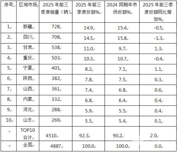 表3,2025年前三季度全国前10区域市场天然气客车销量排行(数据来源:终端上牌信息)