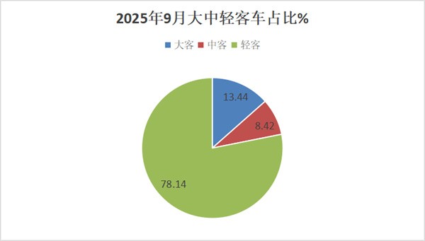 从占比看,大、中、轻客车占据2025年9月客车总销量的比例分别为13.44%、8.42%和78.14%;