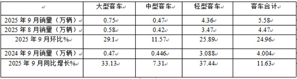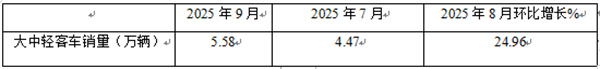 表1、2025年9月大中轻客车同比增长33.17%(数据来源:商用车专业委员会提供的批发信息):