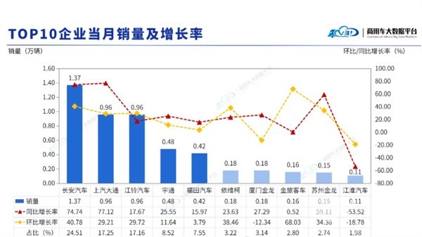 ---重庆长安、上汽大通及江铃汽车排行前三;销量均在0.96万辆以上;其销量分别为1.37万辆、0.96万辆和0.96万辆;其中长安汽车夺冠;其余车企销量均在0.5万辆以下;