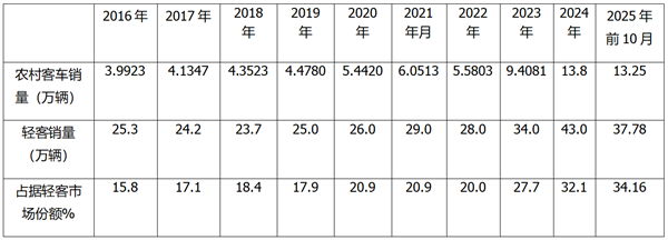 表2,根据终端上牌,2016年---2025年近10年各年农村客车销量及占据轻客市场的比例统计如下: