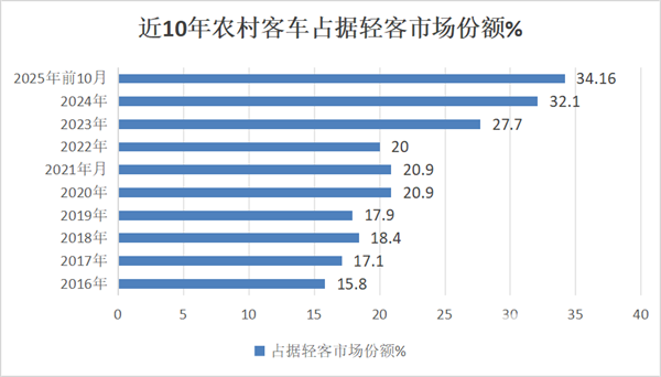 上图表可见,在2025年前10月,我国农村客车占据轻客市场的比例为34.16%,创近10年以来新高。这也是2025年前10月我国农村客车市场一个主要特点,主要得益于“政策+市场+产品”的多轮驱动导致的。
