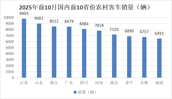 上两图可见,2025年前10月我国农村客车区域流向中,江苏、山东、浙江位居前三;top10累计销量占比6成(60%),可见目前我国农村客车区域分布不均衡。