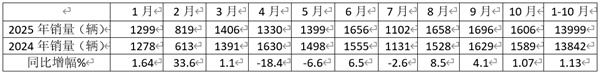 2025年1-10月考斯特客车市场累计销售1.4万辆(13999辆),比去年同期13842辆增长1.13%,累计同比增幅与今年1-9月基本持平。