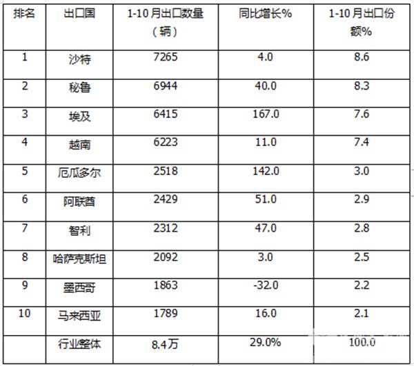 上表显示,2025年10月我国客车出口到TOP10国家中,出口数量同比及市场占比: